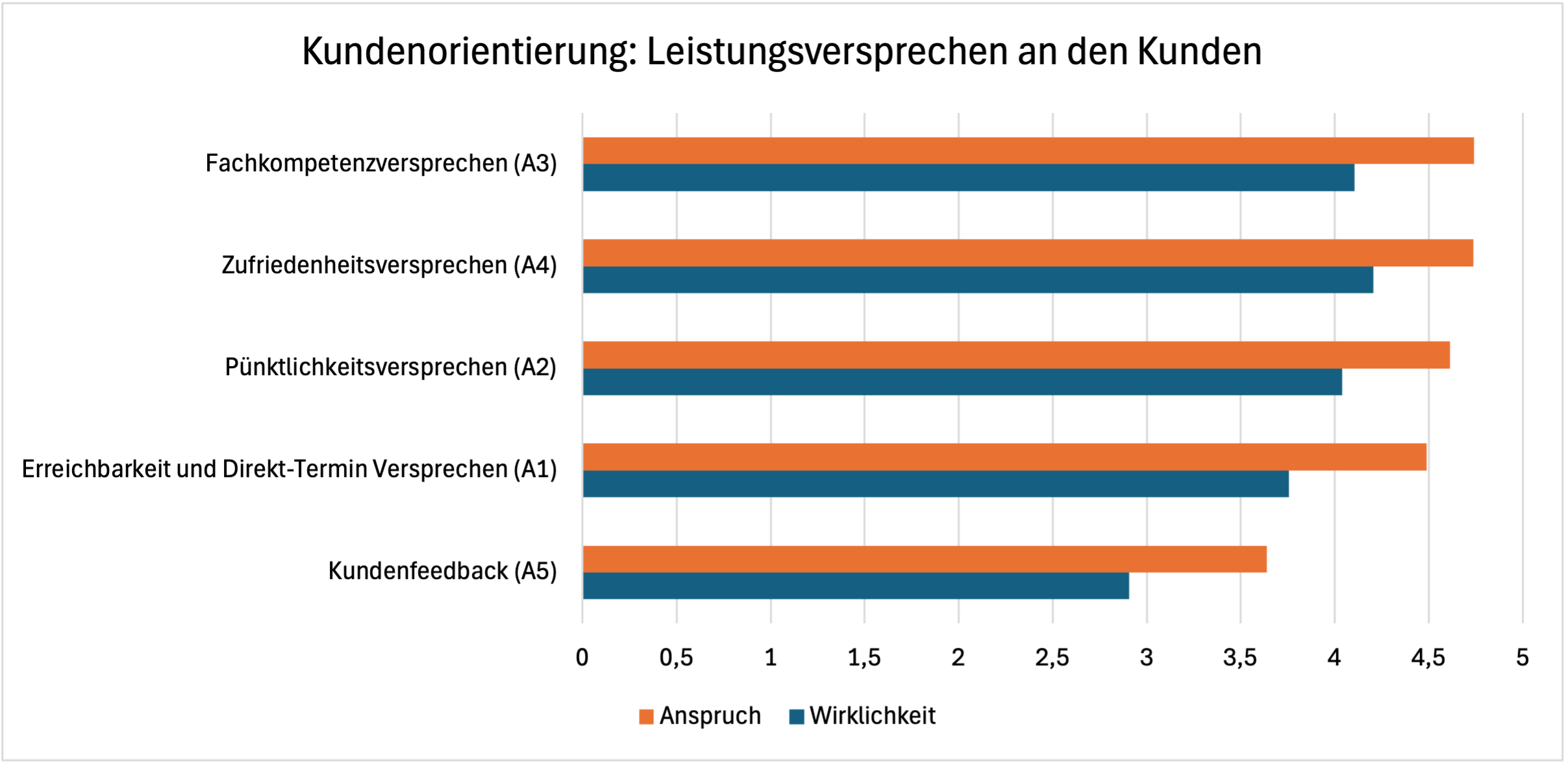 Insgesamt bestehen hohe Ansprüche in der Kunden- und Mitarbeiterorientierung. Jedoch sind in nahezu allen Themenfeldern Diskrepanzen zwischen dem gestellten Anspruch und der tatsächlichen Umsetzung.